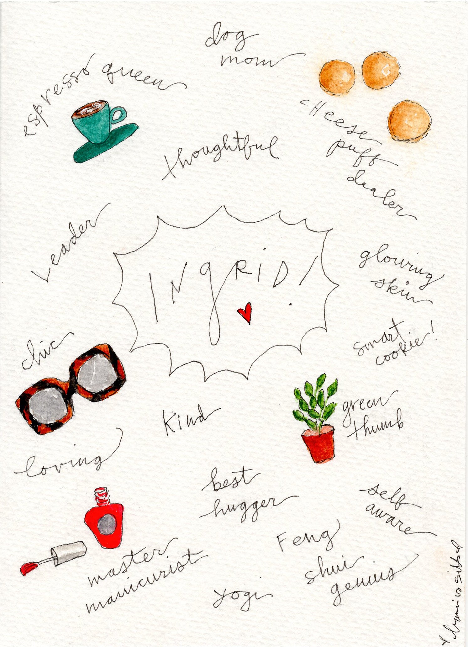WHAT YOU WILL PROVIDE: 10-15 descriptive words for the recipient of the card, 3-5 should include hobbies or things they love (to facilitate the illustrations) - Please include this in the ORDER NOTES at check out.