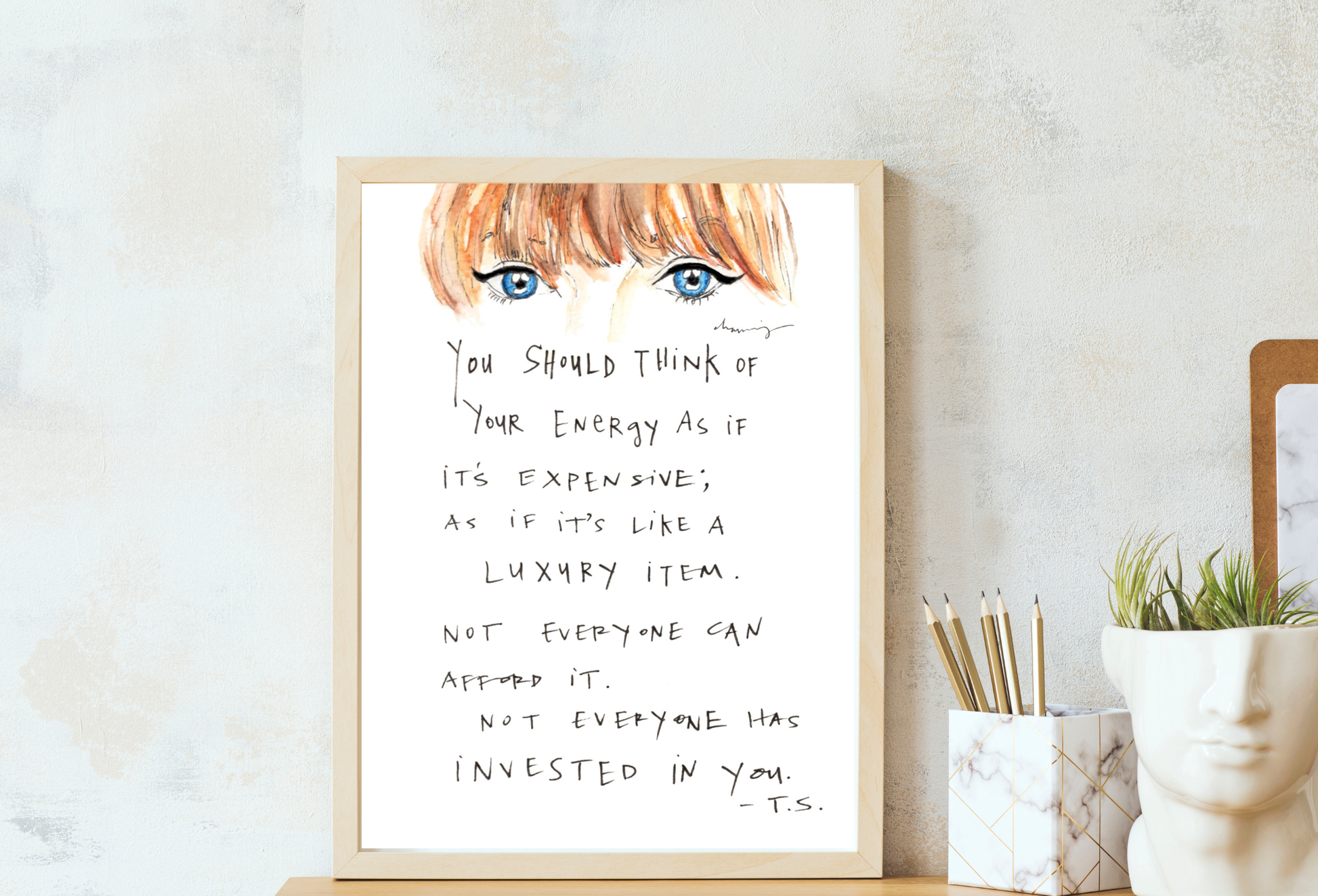 Print of blue eyes and bangs and hand-written below is the T.S. quote: "You should think of your energy as if it's expensive; as if it's a luxury item. Not everyone can afford it. Not everyone has invested in you."